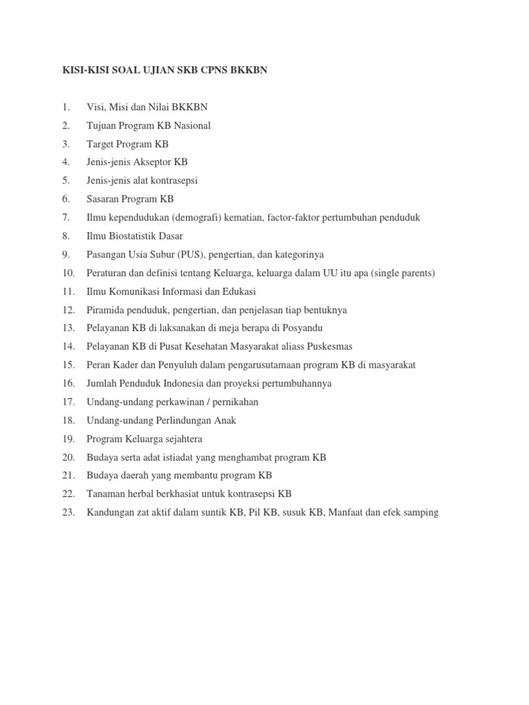 Contoh Soal CPNS BKKBN 2018 Nah untuk mendapatkan Materi Soal CPNS 2018 Badan Kependudukan dan Keluarga Berencana Nasional beserta pembahasan dan jawabannya lengkap. Contoh Soal SKB Penyuluh Keluarga Berencana KB CPNS PPPK 2021 Wah sudah release nih formasi CPNS dari badan Kependudukan Keluarga Berencana Nasional BKKBN tahun anggaran 2021. Serta Kumpulan Contoh Soal CPNS Badan Kependudukan dan KB Nasional dan Pembahasannya.