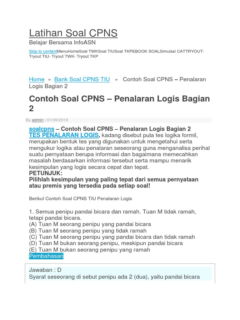 Membahas soal silogisme yang memuat kata. Tuan M tidak ramah tetapi pandai bicara. Kumpulan Soal-soal dan Jawaban Latihan SKD CPNS 2020 Download Materi TWK TIU dan.